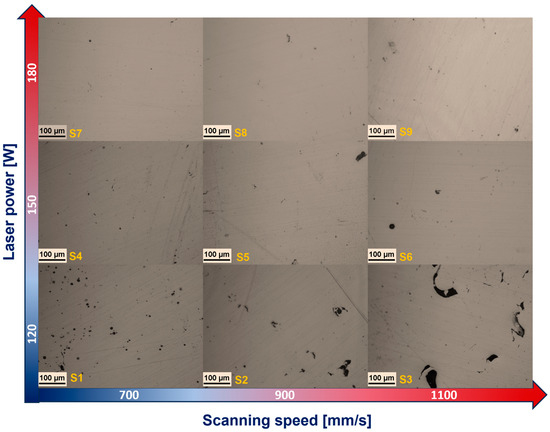 OM images showing the porosity levels of the 316L stainless steel processed by L-PBF using varying scanning speeds and laser power.