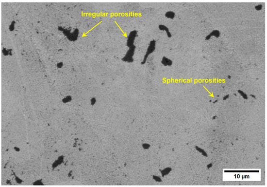 Figure 4 shows the distribution and morphology of a sample with high porosity. The calculated porosity level was 3%, which implies the porosity is closed. A shape factor of about 1 is for spherical pores, while an SP of up to 3.36 was obtained for irregular pores. The reasoning behind shape factors implies that the internal stress concentration around the pores is related to the shape factor. However, the average SP is not directly related to the porosity level. It is worth noting that small pores are generally very close to being perfectly round (SP ~ 1), while large pores are irregular and have a significant internal notch effect on mechanical properties.