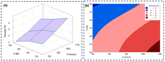 Combining the contour graph and surface plot (Figure 5), a suitable working window can be chosen to control the percentage of porosity by varying laser power and scanning speed. Figure 5a shows a linear behavior, where a higher laser power and a lower scanning speed produces a material with a lower percentage of porosity. Figure 5b shows porosity bands: in the upper left zone is the minimum porosity (<2%); in the central zone, porosity percentages between 2 to 8% can be achieved; and a high porosity is in the lower right zone (>8%).