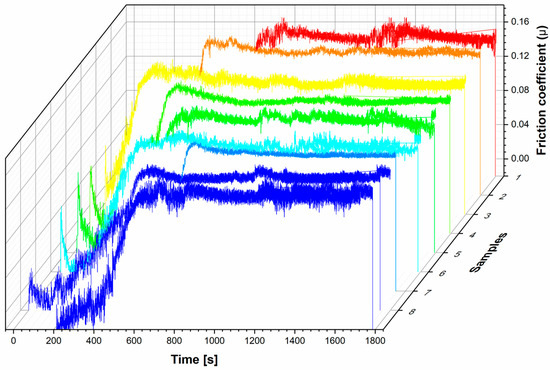 No single model universally describes the synergy between the friction coefficient and wear rate. Several factors, such as surface conditions, hardness, and environmental factors influence this relationship. Figure 6 shows the variation in friction coefficient (µ) during the pin-on-disc test as a function of time. The main difference between the experimental samples is the time to reach the steady-state period. Most samples exceeded the running period of around 400 s (ca. 4 m). In the steady-state period, the µ value varied between 0.122 and 0.151, with an average of 0.137 ± 0.011 (Table 4). However, no relationship between the porosity values and the µ can be observed within the processing parameters evaluated. A comprehensive understanding of the connection between the µ and wear is crucial for enhancing the performance and extending the applicability of biomaterials fabricated by L-PBF.