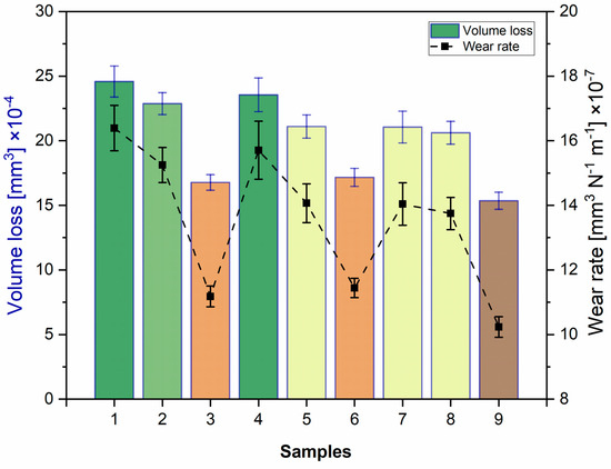 Figure 7 shows the volume loss and the calculated wear rate of the experimental design after the wear tests. Sample 1 exhibited the maximum material loss (24.56 × 10−4 mm3), while sample 9 suffered the lowest loss (15.35 × 10−4 mm3). The wear rate was determined using the Archard relationship [46], and the results showed that it varied slightly between 10 and 17 [mm3 N−1m−1] × 10−7 (Table 4). Samples 3, 6, and 9 displayed the lowest wear rate and corresponded to those with the highest porosity level (Table 2).