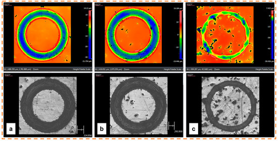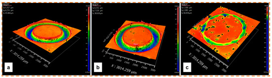 Figure 8 presents the three-dimensional (3D) surface morphology of the wear track of three representative additively manufactured 316L SS with different porosity levels: low (S9), medium (S6), and high (S3) porosity. Figure 8a exhibited the lowest porosity, with an almost constant wear depth. The wear depth reached a value of around 32 µm. The sample with intermediate porosity showed a reduction in the wear depth (19 µm); nevertheless, it maintained the homogeneity in the wear track. Figure 8c illustrates an irregular wear track where only a few zones exhibited wear marks. This behavior may be associated with the fact that as the material is expelled, the pores serve as a reservoir where the lost material is lodged, and consequently, the wear volume is reduced [16].