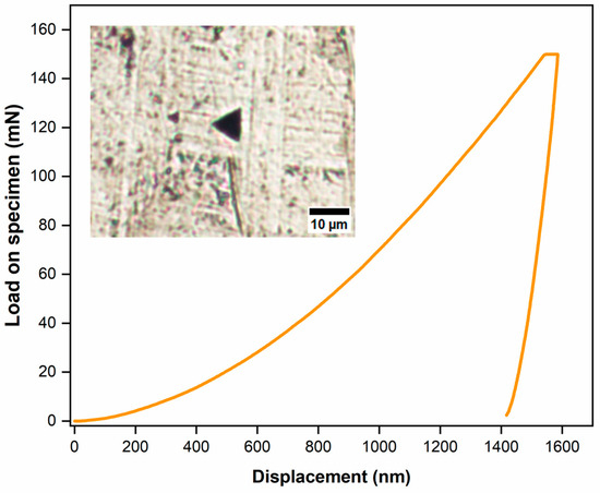 Figure 9 presents the loading–unloading curve after the nanoindentation test, which is representative for testing biomaterials on the nanometer to micrometer scale. According to Oliver et al. [42,47], nanohardness (H) can be used as an indicator of wear resistance. Wear is associated with the capability to withstand severe plastic deformation and can be determined by the ratio between H3 and Er2. A higher H3/Er2 relationship reflects a superior wear resistance [48]. Table 5 summarizes the mechanical response of 316L SS on the nanometer scale. Since the material analyzed is the same, the results of H and Er do not significantly differ. Therefore, the H3/Er2 ratio is almost equal; consequently, no wear response can be obtained.