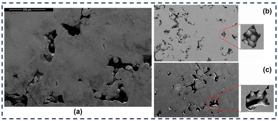 As seen in Figure 10, the high porosity level is associated with the processing parameters. When insufficient energy is applied to melt the powder bed completely, a lack of fusion occurs where the powder remains intact (Figure 10b). Increasing the volumetric energy density slightly melts the powder bed but does not entirely fuse the raw material. As reported by several authors [13,16,49,50,51], to achieve minimum porosity, an energy density higher than 90 [J mm−3] is recommended [45].
