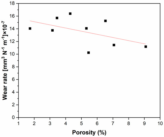 Pores play an important role in representing the potential sites of the first microcracks forming and positively influencing the wear process by entrapping the wear debris and preventing the formation of large abrasive agglomerates. Figure 13 shows a trend between porosity level and wear rate. Lower wear losses were obtained when the porosity was higher than 7%.