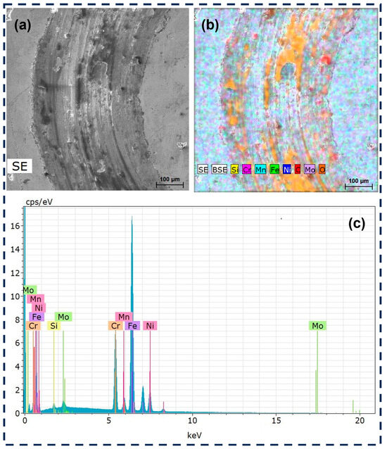 EDS analysis of the wear track: (a) SEM image, (b) elemental mapping, and (c) spectrum of the 316L SS.