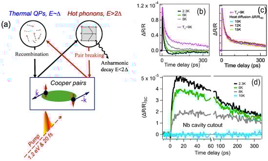 The ultrafast pump–probe technique using femtosecond (fs) laser pulses is a powerful and versatile method for investigating non-equilibrium Cooper pair breaking and quasiparticle dynamics in superconductors. Transient signals measured after ultrafast excitation provide exclusive insight into the out-of-equilibrium processes arising from the conversion between the superconducting condensate and quasiparticles (QPs). In our fs-resolved transient reflectivity scheme, weak 1.2 eV laser pulses break a small fraction of Cooper pairs in the Nb samples. This non-thermal depletion of the superconducting condensate induces a noticeable change in reflectivity at the probe frequency, as illustrated schematically in Figure 1a. This scheme allows us to measure the transient changes in reflectivity as a function of the time delay, temperature, and magnetic field in Nb superconducting states. According to the well-established Rothwarf–Taylor (R-T) model [19], directly corresponds to the thermal quasiparticle density in the weak perturbation regime, where the depletion of superfluid density [20].