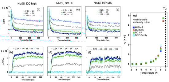 Temperature-dependent photoinduced reflectivity change of Nb thin films and QP density of Nb samples. (a,c,e) Temperature-dependent of Nb thin-film samples from T = 2.2 K to T = 15 K for top figures. (b,d,f) Superconducting state contributions in components subtracted from average normal stage values for bottom figures. (g) Temperature-dependent equilibrium QP densities of HiPIMS, DC high power, DC LH power, SRF cavity samples. Pump fluence is set to be 3.0 J/cm2.