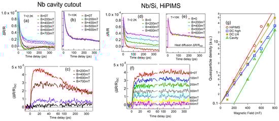 Magnetic-field-dependent of Nb samples. (left) Nb SRF cavity cutout : (a) low temperature at T = 2.2 K, (b) normal state at T = 10 K, (c) SC component subtracted from average 10 K value. (middle) Thin-film Nb HiPIMS : (d) low temperature at T = 2.2 K, (e) normal state at T = 10 K, (f) subtraction from average 10 K value. (g) Magnetic-field-dependent thermal-equilibrium QP densities of HiPIMS, DC high, DC LH, and SRF cavity samples. Pump fluence is set to be 3.0 J/cm2.