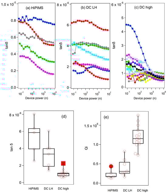 Power-dependent microwave characterization of Nb thin-film resonators. Loss tangent power spectra for three selected resonators made with (a) HiPIMS, (b) DC LH, (c) DC high samples. The device power (n) is converted to no. of photons operating at 5 GHz frequency. Different color traces are from different measurement scans. (d) Box plot of averaged loss tangent and (e) averaged internal of Nb thin-film resonators. Each point in box plots is median value for one measurement, showing variation between different measurement sweeps. Filled points are outlier values far from median values.