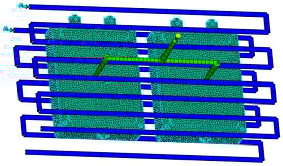 The design of the pouring system has a significant impact on the forming quality of the junction box. Based on practical engineering experience, the first mock examination and two cavity pouring schemes are selected for the pouring system. To ensure the surface quality of the junction box shell, the gate position is fixed on the outside of the product. The cooling system can evenly cool the product after molding, reduce residual stress, maintain the dimensional accuracy of the plastic parts, and improve quality. The cooling system of the junction box adopts a simple and easy-to-process DC circulating cooling water channel, with specific parameters: the diameter of the water pipe is 10 mm, and the distance between the water pipe and the plastic parts of the parts is 20 mm. Establish a finite element model of the junction box for the pouring system and cooling system as shown in Figure 3.