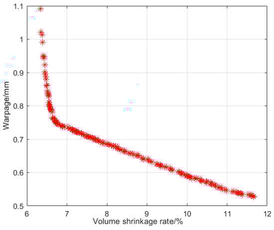 According to the optimization results shown in Figure 6, the algorithm has good convergence and can obtain a uniformly distributed Pareto optimal solution set. In this study, the multi-objective optimization model has two objective functions, and its Pareto front is a straight line. This indicates that the optimization trends of the volume shrinkage rate and warpage deformation of the junction box are opposite; that is, smaller warpage deformation corresponds to a larger volume shrinkage rate. It is difficult to obtain the optimal process parameters that achieve the minimum of both at the same time. In reference [19], the equal-weight TOPSIS method was used to obtain the optimal solution from the Pareto optimal frontier. In this study, the CRITIC comprehensive evaluation method was used to analyze and obtain the optimal process parameters, and both the volume shrinkage rate and warpage variables were found to be optimal. TOPSIS ranks each solution based on its proximity to the optimal and worst solutions, to determine the optimal design [35]. TOPSIS is suitable for multi-criteria decision-making and ranking problems. The CRITIC weighting method calculates and ranks the weights by constructing a judgment matrix and calculating consistency indicators. The CRITIC weighting method is suitable for multi-criteria evaluation and decision-making problems. The specific expression of the comprehensive evaluation model is as follows [36]: