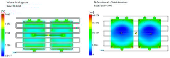 Comparing the optimal results of the process parameters before optimization in Table 3, it can be seen that the NSGA-II algorithm improves the warpage deformation during the injection molding process of the junction box. The above process combination was applied to Moldflow for the numerical simulation calculation, and the calculated volume shrinkage rate was 7.037%, with a warpage deformation of 0.957 mm, as shown in Figure 7. The relative errors of the volume shrinkage rate and warpage deformation predicted by the NSGA-II algorithm were 1.9% and 3.4%, respectively, indicating a high degree of agreement between the two. This is similar to the findings of the literature [11,18,19,35]. By establishing a multi-objective optimization model and using the NSGA-II algorithm, the injection molding process parameters can be optimized to improve the molding quality of injection molded products.