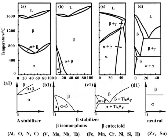 The four typical phase diagrams of titanium alloys: (a,a1): Phase diagram of α stable elements; (b,b1): Phase diagram of β isomorphic stable elements; (c,c1): Phase diagram of β eutectic stable elements; (d,d1): Phase diagram of a neutral stable element; [4,12].