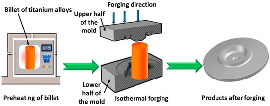 The introduction of the isothermal forging process enables the precise machining of complex shapes while maintaining material performance [22]. The fundamental principle of isothermal forging technology involves heating the mold to a temperature that matches or is close to the deformation temperature of the billet and achieving near-net-shape forging by controlling pressure during low-speed deformation [23]. As shown in Figure 2. The titanium alloy billet is transferred to the isothermal forging equipment when it is heated to the forging temperature, at which time the die has been heated to the same equipment as the billet. By controlling the forging rate, the titanium alloy is plasticized into the desired shape, completing the whole near-net-shape forging process. In the forming process, titanium alloys can deform plastically in a uniform manner while maintaining lower deformation resistance, thus addressing poor forming performance and the chilling effects caused by the mold [24]. Under quasi-static temperature conditions, dynamic recrystallization happens uniformly, preventing the issues of residual stress and poor microstructural uniformity arising from the temperature gradients and uneven internal deformation of the conventional forging process. This contributes to the improved structural stability and lifespan of titanium alloy forgings. Therefore, this process enables the production of near-net-shaped complex structures and significantly improves the dimensional accuracy and performance of forgings [25]. Additionally, based on Pascal’s law, only low-power equipment is needed to generate several times higher pressures, thereby facilitating the forging of large and complex structural components. Controlling the forging speed enables the production of high-precision components with intricate shapes, greatly minimizing energy consumption and material waste. During isothermal forging, the grains of titanium alloys gradually refine and become denser under constant temperature and lower strain rates [26]. Grain refinement helps resist dislocation and crack propagation, reduces porosity and defects within the material, and further enhances the comprehensive performance of titanium alloys. Thus, for titanium alloys that have high raw material costs and considerable deformation resistance, the use of isothermal forging to achieve near-net-shape forming can strengthen the internal structure to meet performance requirements while conserving raw materials and lowering processing costs [27].