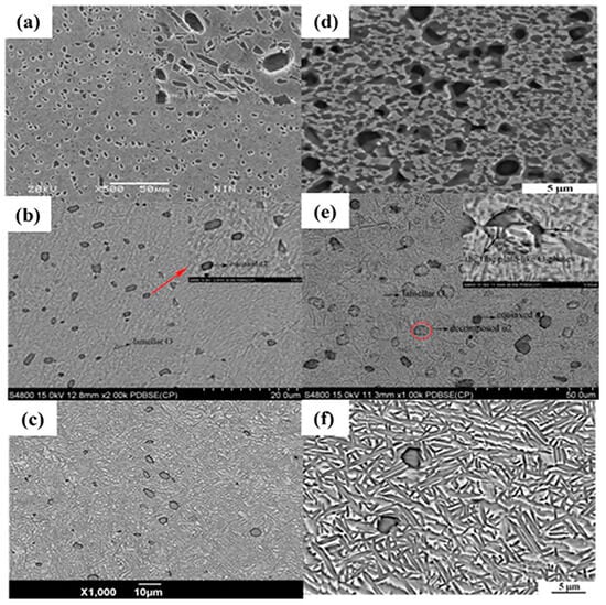 SEM mages images of Ti-22Al-25Nb alloy: (a) 980 °C, (b) 1040 °C, and (c) 1060 °C.; Solution-treated, aged tissues: (d) 980 °C, (e) 1040 °C, and (f) 1060 °C [38].