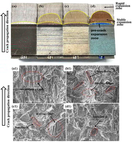 Temperature impacts the grain size and morphology of titanium alloys during forging, which subsequently affects their performance. Isothermal forging results in smaller grains and primary α phases compared to conventional die forging, which aids in enhancing the material’s plasticity and toughness. Under high-temperature conditions, the refined grains and uniform structure can better withstand thermal stress and creep deformation, thereby improving the material’s high-temperature strength and service life. Jia et al. [39] analyzed the fracture mechanisms and tensile properties of Ti-Al-Sn (Ti60) alloys at 200 °C, 400 °C, and 600 °C, respectively. The findings indicate that high temperatures alleviate dislocation accumulation and activate more slip systems, thereby enhancing deformability and ductility. Fracture toughness increases with increasing temperature, showing the following three stages: the pre-crack propagation zone, stable crack propagation zone, and rapid crack propagation zone, which are marked with yellow curves in the cracks, as shown in Figure 3. In unheated titanium alloys, the main crack alters its direction during propagation, and secondary cracks tend to form at the α boundaries, marked with red circles in Figure 4a1. As the temperature increases, the number of accessible slip systems also rises, leading to isolated lamellar α phases on the fracture surface, as illustrated in Figure 4b1. Due to the presence of grain orientations that are relatively difficult to deform, more tear ridges become evident on the fracture surface, especially within the lamellar α phase in Figure 4c1. Ultimately, the lamellar α morphology on the fracture surface disappears in Figure 4d1. This is because, at higher temperatures, more slip systems can be activated, significantly enhancing ductility. Conversely, the secondary α phases and residual β phase boundaries in the β β-transformed structure pose significant obstacles to slip, complicating the deformation process and leading to a substantial increase in strength. Zhang et al. [40] found that the strength and ductility of the innovative metastable β titanium alloy Ti-6Mo-5V-3Al-2Fe are greatly influenced by the average width and spacing of the secondary α phases. Therefore, to enhance the alloy’s strength and toughness while minimizing the secondary α phase and avoiding grain coarsening, higher forging temperatures should be selected whenever possible.