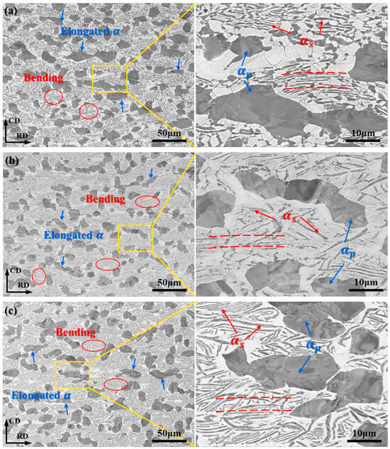 Variations in strain rates can induce phase transformations, leading to varied microstructures [45]. Chai et al. [46] explored how different deformation strain rates affect the microstructure evolution of the α/β dual-phase Ti-6.5Al-3.5Mo-1.5Zr-0.3Si (TC11) alloy. In Figure 5, the primary equiaxed structure (αp) and the lamellar microstructure (αs) displayed substantial alterations compared to the original microstructure, as illustrated by the red ellipses and dashed lines. As the strain rate increases, the alloy’s elongation also rises; concurrently, the breakage of the lamellar structure becomes pronounced, causing the formation of numerous short rod-shaped α phases.