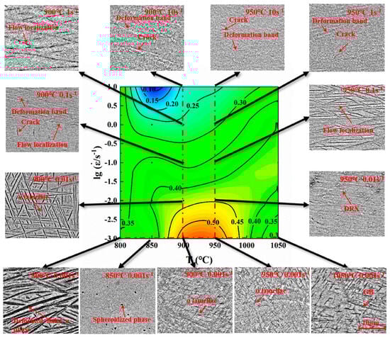 The mechanisms of deformation in titanium alloys differ under varying strain rates. With increasing strain rates, the major controlling factors for alloy deformation are in the following order: the diffusion-controlled creep process, thermally activated dynamic recovery and recrystallization processes [50,51,52], and the shear process influenced by localized heating. Adiabatic shear bands represent a common failure mode for materials subjected to high strain rates. Xue et al. [53] examined the hot processing map for the Ti-6Al-2Sn-4Zr-6Mo (TC19) alloy and found that strain rate has a primary influence on its thermal deformation mechanisms. Figure 6 illustrates the SEM images at different temperatures and strain rates. At a strain rate of 0.001 s−1, the lamellar α phase in the structure is gradually spheroidized with increasing temperature. As the strain rate increases, cracks and more unevenly distributed lamellar α phases also progressively appear in the microstructure. Furthermore, Zhang et al. [54] examined the behavior of deformation-induced α/β phase transformations in the Ti-6Al-2Zr-1Mo-1V alloy during hot processing, revealing that αp can convert into the β phase under hot deformation conditions. Moreover, excessively high strain rates can result in incomplete recrystallization of the material at high deformation temperatures, leading to microstructural inhomogeneity and stress concentration during deformation [55]. Consequently, the processes governing microstructural evolution in titanium alloys are highly complex. Table 2 summarizes some of the microstructural evolution patterns of titanium alloys to provide partial references for studying the deformation process of isothermally forged titanium alloy.