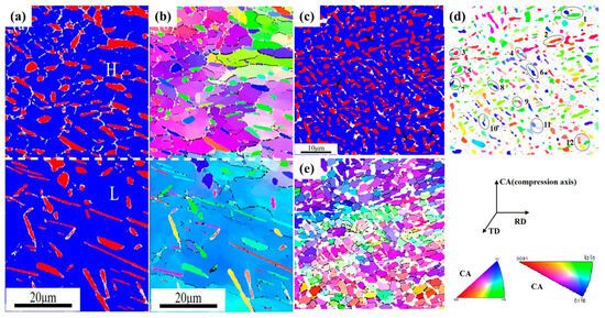 The EBSD results for the Ti-5Al-4Mo-4Cr-2Sn-2Zr alloy deformed to height reductions of 20%: (a) phase diagram and (b) inverse pole figure. The EBSD results for material deformed to height reductions of 60%: (c) phase diagram, (d) inverse pole figure of alpha phase, and (e) inverse pole figure of the β phase [57].