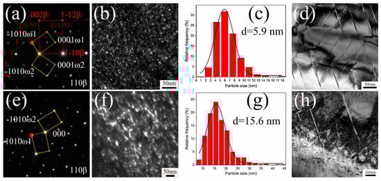 TEM image of Ti−5Mo−3Cr−Fe−3Zr alloy after cooling: (a–d) water quenching and (e–h) air cooling. (a,e) Record the diffraction pattern of the selected region along the [110]β region axis. (b,f) Darkfield image using −1010ω1 points circled in (a,e). (c,g) Particle size distribution of the ω phase in water-quenched and air-cooled alloys. (d,h) Bright field images of the α″ [64].