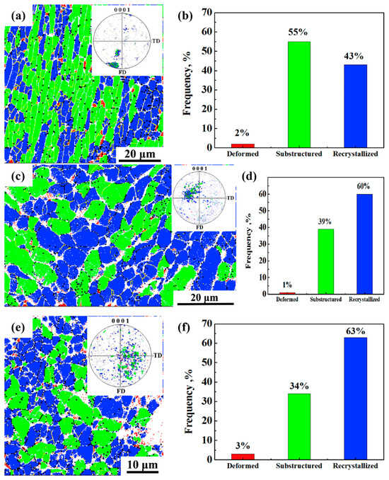 The degree of recrystallization of the Ti-6Al-4V alloy after isothermal forging the first step (995 °C, 1 × 10−2 s−1): (a) recrystallization image, (b) recrystallization fraction map; after the second isothermal forging step (950 °C, 1 × 10−3 s−1), (c) recrystallization image, (d) recrystallization fraction map; and after the third isothermal forging step (850 °C, 1 × 10−3 s−1), (e) recrystallization image, and (f) recrystallization fraction map [68].
