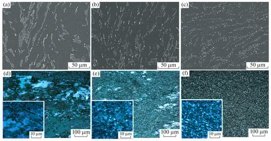 Microstructure of the Al-Mg-Fe-Ni-Zr-Sc alloy at 350 °C: (a,d) 2 cycles, (b,e) 4 cycles, and (c,f) 5 cycles [70].