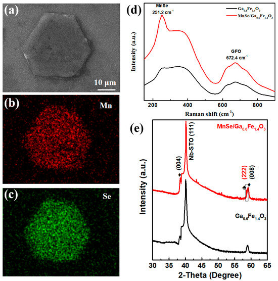 (a) SEM diagram of the MnSe/GFO heterostructures. (b,c) Elemental distribution of Mn and Se in the MnSe/GFO heterostructure. (d) Raman spectra comparing the MnSe/GFO heterostructure with a control single GFO film. (e) XRD patterns for the synthesized MnSe/GFO heterostructures and a control single GFO film. In the patterns, the ♣ symbol denotes GFO peaks, while the ♦ symbol indicates MnSe peaks.