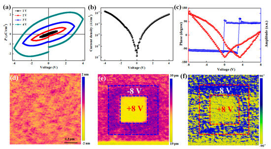 In order to investigate multiferroic properties in the MnSe/GFO heterostructure, the macroscopic and local ferroelectric properties were systematically characterized in Figure 2. Meanwhile, the macroscopic and local ferroelectric properties also are measured in heterostructures consisting of MnSe nanosheets and 60 nm GFO, as shown in Figure S2. The conductive Nb-STO substrate serves as the bottom electrode. In Figure 2a, the polarization-electric field (P-E) loops of MnSe transferred onto 45 nm GFO are presented. They were assessed at various maximum test voltages, operating at 1 kHz. Notably, regardless of the voltage applied, all loops exhibited an unsaturated behavior, attributed to significant leakage current in the GFO. Figure 2b illustrates the corresponding dependence of current density on voltage bias, depicting the leakage factor. Notably, when applying a voltage of 4 V, the leakage current density can reach 2 × 10−3 A/cm2. The leakage current in GFO-based heterostructure is a common problem, as previous results show. To weaken the influence of the leakage current effect, the piezo-response force microscopy (PFM) measurement is a useful method to prove the microscopic ferroelectric in MnSe/GFO heterostructure. In Figure 2c, both the phase hysteresis loop and amplitude butterfly curve distinctly demonstrate symmetric ferroelectric switching behavior, underscoring the stability of polarization states within our heterostructure sample. Notably, phase reversal exists at a coercive voltage of <2 V in the tip-polarized position, where the 180° phase contrast obviously indicates polarization switching and thus confirms room-temperature ferroelectricity in this heterostructure.