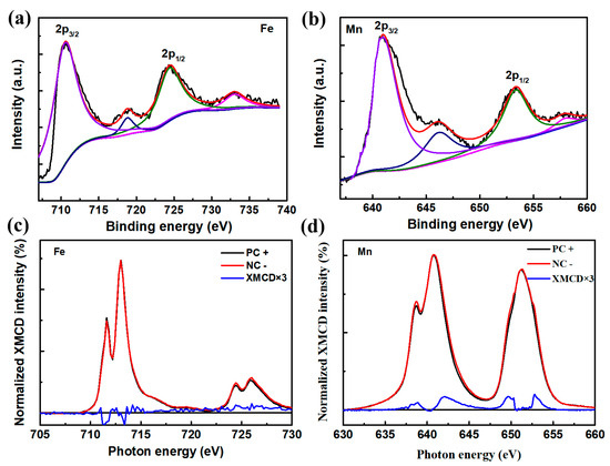 (a,b) XPS signals from Fe 2p and Mn 2p orbitals, respectively. (c,d) The XAS and XMCD of Fe and Mn elements for MnSe/GFO heterostructures at 10 K.