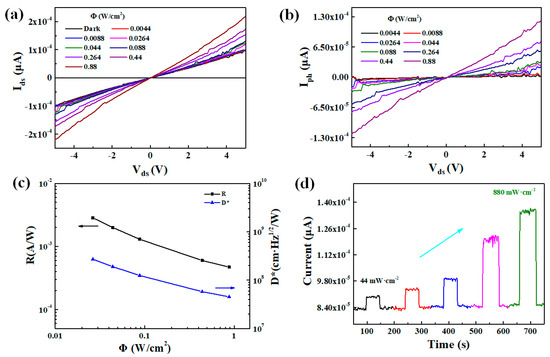Given the prior discussions, it is anticipated that the p-type semiconductive MnSe nanosheet would exhibit excellent optoelectronic properties [33]. To verify if these properties are retained in the MnSe/GFO heterostructures, its optoelectronic and electronic behaviors were investigated. MnSe/GFO photodetectors were constructed through a single-step laser direct writing process, with Cr/Au used for electrode deposition. The photoresponse characteristics were comprehensively assessed under ambient conditions (excitation source = 532 nm laser; α-MnSe optical bandgap = 2.0 eV). Figure 5a demonstrates the output curve obtained under both illuminated and non-illuminated conditions. The source-drain current demonstrates a linear dependence on power density, suggesting an ohmic contact between the electrodes and the MnSe/GFO channels. Figure 5b demonstrates the relationship between the photocurrent (Iph) and voltage under different incident power densities. Iph is calculated as Iph = Ilight − Idark the difference between the irradiated current, Ilight, and the dark current, Idark). The linear correlation between the Iph and the power densities suggests that the photocurrent is primarily determined by absorbed photons. Furthermore, stability and reproducibility under periodic illumination with different incident wavelengths were measured. Figure 5c presents the calculated responsivity (Rλ) and detectivity (D*) under variable incident light conditions, indicating the photon-to-electron conversion efficiency and responsiveness of the photodetector. The values of Iph, D*, and Rλ are crucial metrics for assessing photodetector performance. Utilizing the formulas D* = RλS1/2/(2eIdark)1/2 and Rλ = Iph/PS (where P, λ, and S denote the incident laser power density, wavelength, and efficient detection region, respectively), the MnSe device shows outstanding photoresponse to a 532 nm laser at 44 mW/cm2, yielding an Iph of 2.1 × 10−5 μA with a maximum Rλ of 2.8 × 10−3 A/W, and a D* of 6.3 × 108 Jones. Figure 5d depicts a monotonically increasing photocurrent with the increase in the light intensity at 532 nm. Consequently, the responsivity in the MnSe/GFO device surpasses those reported for semiconductor materials such as α-MnSe, MoS2, and WS2 [34,35,36].