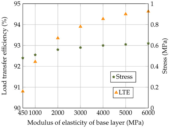 - With an increase in the modulus of elasticity of the base layer from 450 MPa to 6000 MPa, this study shows a 4% increase in the LTE and a 23% increase in stress. However, beyond 3000 MPa, the difference in the LTE and stress become more gradual, reaching approximately 0.38% and 3.2%, respectively.