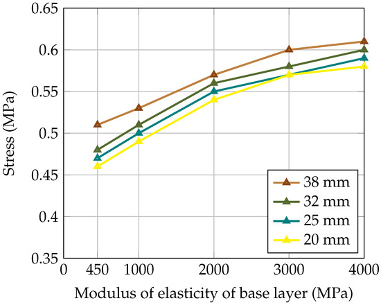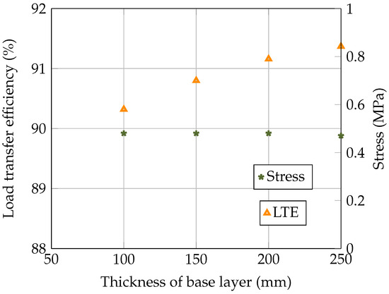 - The results demonstrate that as the base layer’s thickness increases from 100 mm to 250 mm, the LTE improves by 1.2%. Conversely, the stress remains the same for thicknesses of 100 mm, 150 mm, and 200 mm, while a 2.1% decrease in stress is noticed at a thickness of 250 mm.