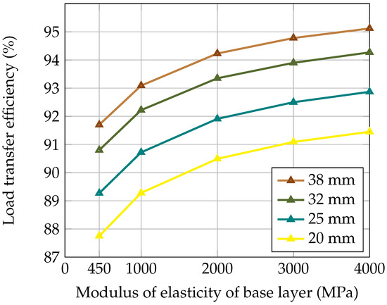 - The results show that increasing the dowel bar’s diameter significantly improves the LTE but also increases the stress in the concrete slab. However, the differences in the LTE and stress are more notable for smaller diameters and relatively flexible base layers. For base layer moduli of 450 MPa and 4000 MPa, the increase in the LTE and stress from a 20 mm to a 38 mm dowel bar were 4.3% and 3.8% and 10% and 5%, respectively.