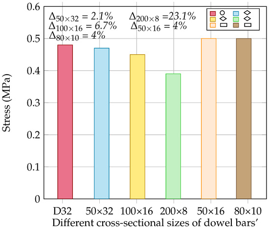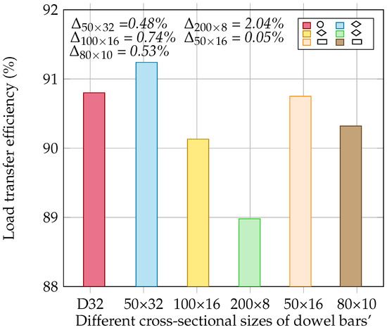 - With a diamond-shaped dowel bar of a 50 × 32 mm size, a 0.48% increase in the LTE and a 2.1% decrease in stress are observed compared to these values for the rounded dowel bar, whereas diamond-shaped dowel bars with sizes of 100 × 16 and 200 × 8 show 0.74% and 2.0% decreases in the LTE, respectively, along with significant stress reductions of 6.7% and 23.1%. For a rectangular dowel bar with a size of 50 × 16, the LTE is approximately similar to that for the rounded dowel bar, while for a size of 80 × 10 mm, a 0.53% reduction in the LTE is noted. However, a 4% increase in stress is seen for both rectangular sizes.
