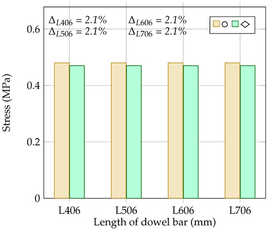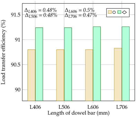 - The diamond-shaped dowel bar improves the LTE by 0.48% for lengths of 406 mm and 506 mm and by 0.5% and 0.47% for lengths of 606 mm and 706 mm, respectively, compared to that with the rounded dowel bar. Additionally, the diamond-shaped dowel bar reduces the stress in the concrete slab by 2.1% relative to that with the rounded dowel.