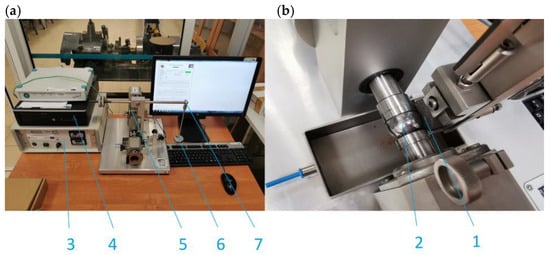 T-20 test stand: (a)—main components; (b)—friction pair; 1—sample; 2—counter sample; 3—control unit; 4—PC; 5—motor; 6—load; and 7—lever with counterweight.