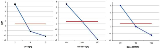 where η (ETA)—signal-to-noise ratio (S/N) function; m—number of measurements for a single sample; and x—average friction force value of a single test allowed for the designation of functions to determine the values of the ETA function.