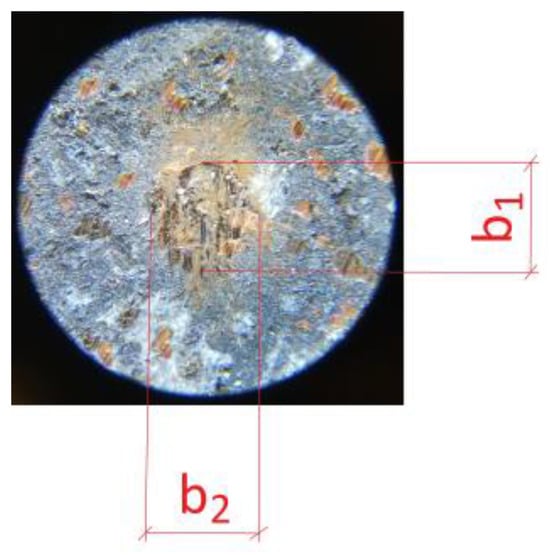 The next step was to determine the abrasive wear rate coefficient of the prepared materials. This is an extremely isotonic parameter, as it determines the service life of the brake pad. The sizes of the craters formed in the samples were used to determine it. The craters were measured in two planes: in line with the friction direction (b1) and perpendicular to it (b2). A Delta Optical microscope and a Brinell magnifying glass were used for this purpose (measuring example on Figure 4).
