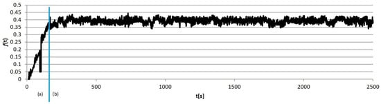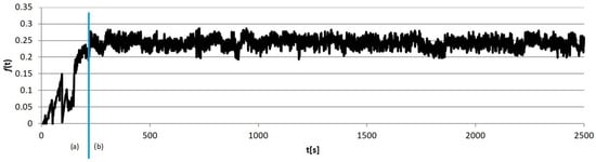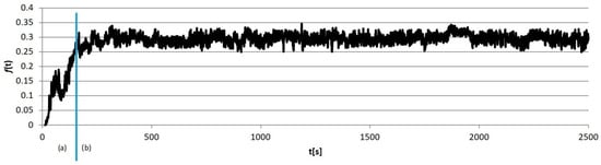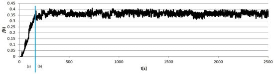 Example calculation results obtained for individual sample groups are presented in Figure 5, Figure 6, Figure 7 and Figure 8. Each of them marked the running-in period (a), in which the geometrical “matching” of the sample and counter-sample took place. The clear end of this process resulted in the transition to the so-called proper friction. In further considerations, the running-in periods were rejected, and only the periods of proper friction were subjected to analysis.