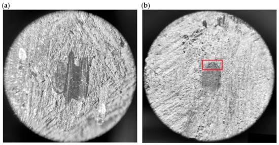 In the next stage, the abrasive wear rate coefficient was calculated for individual groups of samples. For this purpose, it was necessary to measure the size of craters formed as a result of the test. By substituting the measurement results into Equations (2) and (3), the values of the kc coefficients for individual samples were obtained. Next, the mean values and standard deviations were calculated using the same methods as for the friction coefficients. The results are presented in Table 7.