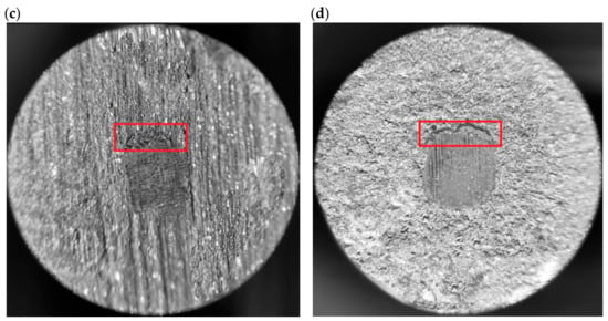 Craters on samples from group (a) S1, (b) S2, (c) S3, and (d) S4; the red line indicates the accumulation of lubricant material (40 × magnification).
