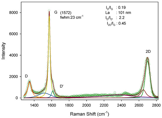 Raman spectroscopy was used to evaluate the quality of the graphene-based material. The study was performed using a Renishaw inVia confocal Raman microscope (Renishaw, Gloucestershire, UK) with the following specifications: excitation (cw): 532 nm, 633 nm, 1064 nm, and 325 nm laser; configuration: backscattering; spatial resolution: 0.5 µm; resolution: approximately 1.5 cm−1; spectral range (Raman shift): 50 cm−1, 6000 cm−1; experimental temperature: room temperature.