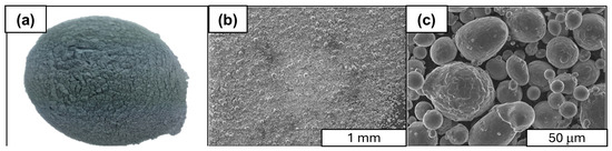 The SEM images of aluminum powder used in the synthesis: (a) surface of aluminum powder; (b,c) SEM images of aluminum powder surface; (b)—magnification: 50×; (c)—magnification: 1000×.