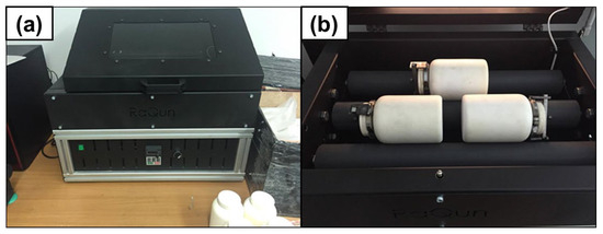 As a result of preliminary research, several variants of the mixing process were developed using ball mills and turbines, allowing a homogeneous distribution of carbon materials throughout the entire volume of the matrix, consisting of spherical aluminum powder. The devices used for the mixing process are presented in Figure 7.