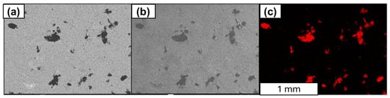The carbon distribution map for the Al-FLG (0.2 wt.%) powder mixture at 50× magnification is shown in Figure 9a,b, and the contrast and unambiguous content of the carbon material can be observed in Figure 9c.