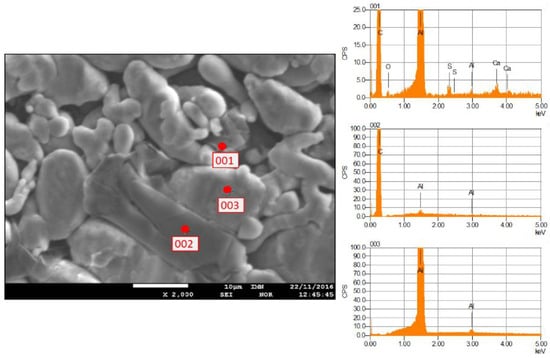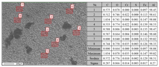 Based on the analysis of the element distribution map for area 2, the powder mixture of Al-FLG (0.2 wt.%), the measurement taken at point 001 according to the CPS chart indicates that the carbon material was not distributed in the examined area. This is further confirmed in Figure 13.