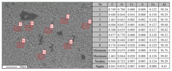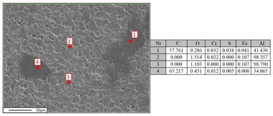 Quantitative analysis of the chemical composition was performed using wavelength-dispersive spectroscopy (WDS). In Figure 10, Figure 11 and Figure 12, the locations of the points selected for the chemical composition analysis of the Al-FLG mixture (0.2 wt.%) are presented, along with the results of the analysis. Furthermore, Figure 10 shows the obtained EDS analysis spectrum obtained for the examined area.
