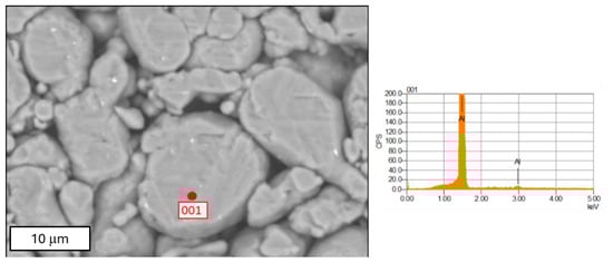 For a detailed analysis, the spherical aluminum powder was examined using scanning microscopy (see Figure 4). The investigations were conducted on loosely scattered powders, as well as on compacted powders, to reveal their chemical composition, morphology, and particle size.