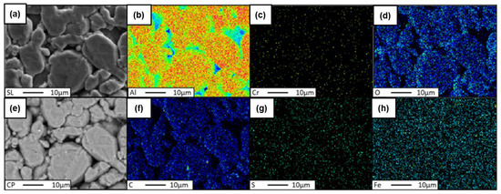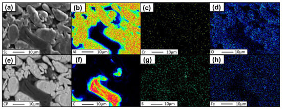 Element distribution map for region no. 1, powder mixture no. 2 Al-FLG (1.0 wt.%), surface 2000×: (a) SL, (b) Al., (c) Cr, (d) O, (e) CP, (f) C, (g) S, and (h) Fe.
